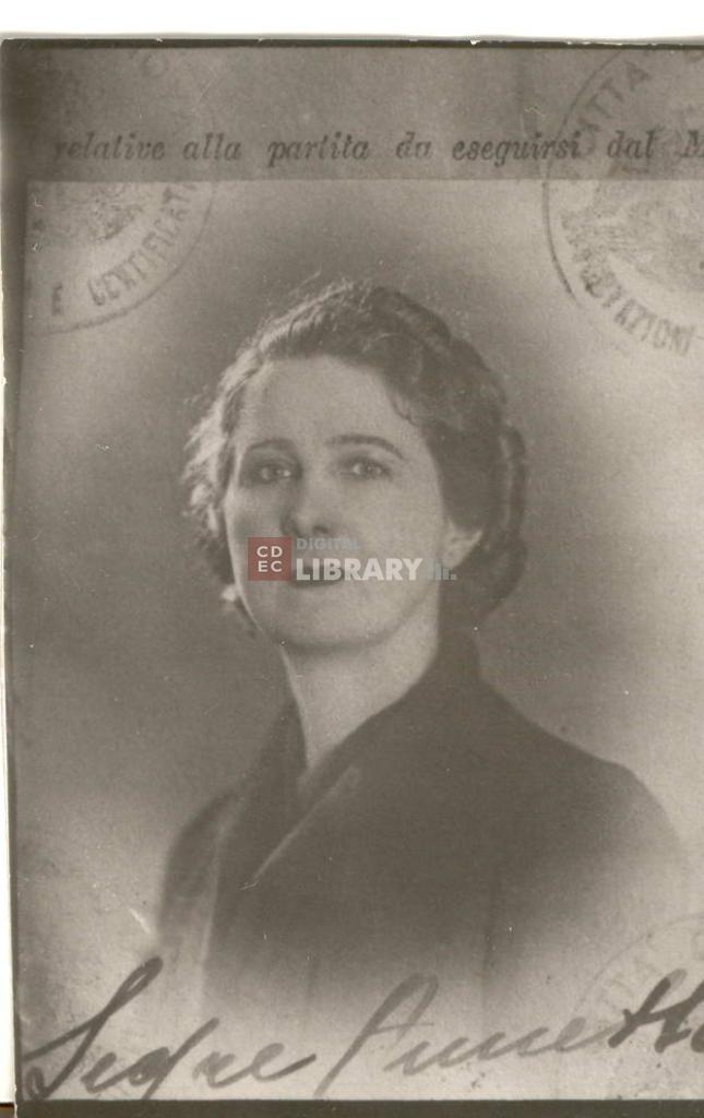 iscrizioni | nell'immagine: "Segre Annetta" - sul verso del supporto: "partita da Genova per Milano 14-2-44 [...] 24-2-97 Vercelli" |