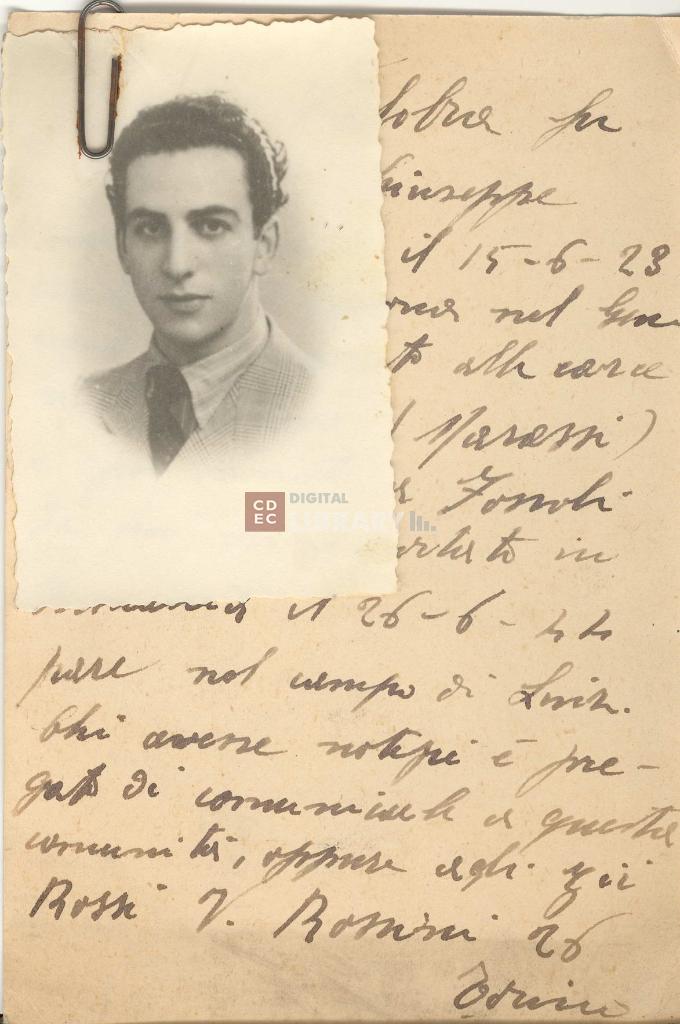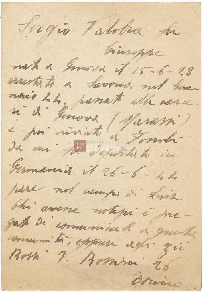 | osservazioni | In allegato foglio manoscritto con la scritta: "Sergio Valobra fu Giuseppe nato a Genova il 15-6-23 arrestato a Savona nel Gennaio 44, passato alle carceri di Genova (Marassi) e poi rivisto a Fossoli da cui fu deportato in Germania il 26-6-44 pare nel campo di Sviz [sic] Chi avesse notizie è pregato di comunicarle a questa comunità, oppure agli zii Rossi via Rossini 26 Torino" |