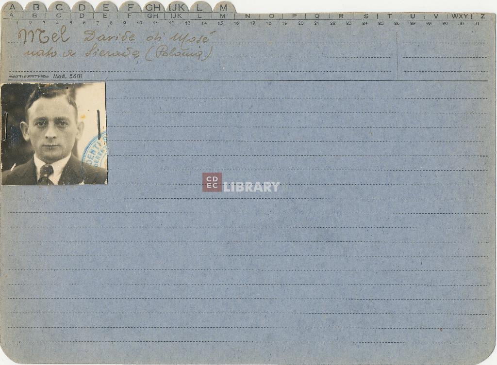 | osservazioni | La scheda di Mel David si presenta disomogenea rispetto al resto della collezione perché si tratta di uno straniero arrestato all'estero, di cui furono richieste informazioni anche in Italia presso il CRDE. |