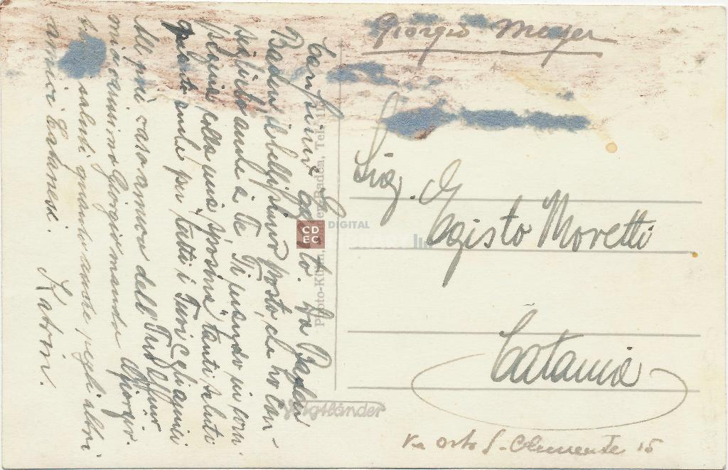 | iscrizioni | sul verso del supporto: "Carissimo Egisto. Da Baden Baden il bellissimo posto, che ho consigliato anche a te. Ti mando in compagnia colla mia sposina tanti saluti [...] anche per tutti i Tuoi e gli amici. Tuo aff.mo Giorgio / Al più caro amico del mio carissimo Giorgio mando tanti saluti quanto anche degli altri amici Catanesi. Katrin" - sul recto del supporto secondario: "Meyer Giorgio" |