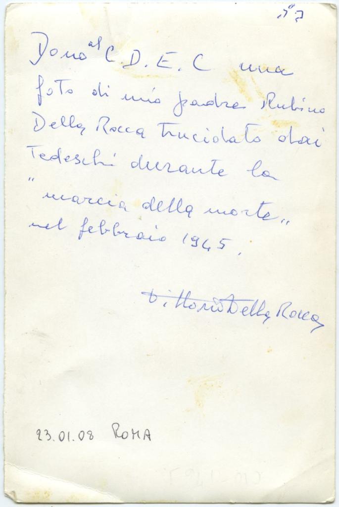 | iscrizioni | sul verso del supporto l'indicazione manoscritta "Dono al C.D.E.C. una foto di mio padre Rubino Della Rocca trucidato dai tedeschi durante la "marcia della morte" nel febbraio 1945/ Vittorio Della Rocca" e l'appunto "23.01.08 Roma" |
