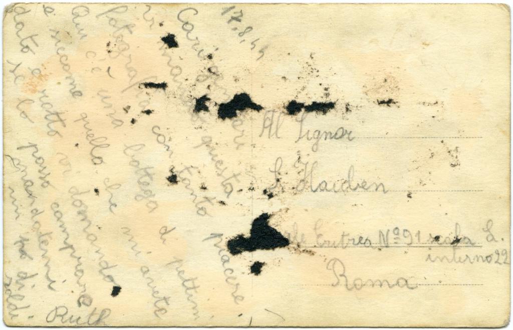 | iscrizioni | Sul verso del supporto: "Al Signor S. Hauben, Viale Eritrea n. 91, scala S interno 22, Roma / 17.8.44 / Cari genitori vi mando questa fotografia con tanto piacere. Qui c'è una bottega di pettini e siccome quello che mi avete dato è rotto vi domando se lo posso comprare. Mandatemi un po' di soldi. Ruth" |