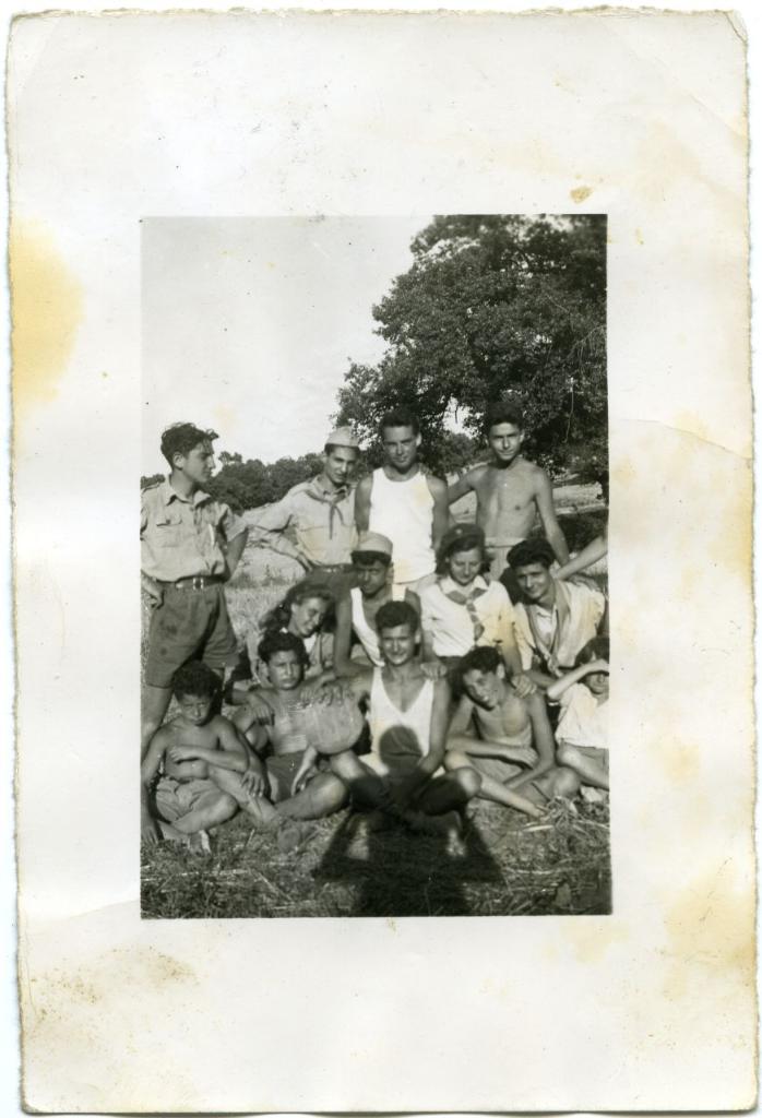 | osservazioni | Zofim romani in un campeggio nell'estate del 1949. Fila dietro in piedi da sinistra Mimmo Calò; una persona non identificata; Sasha Hirschler; Shimon Fischer. Davanti a loro, con il cappello chiaro Beniamino Di Segni e, alla sua sinistra,con il cappellino Ziva Fischer. Davanti a loro a gambe incrociate da destra Igal Shunnach; Reuven Di Capua; Sandro Kichelmacher |