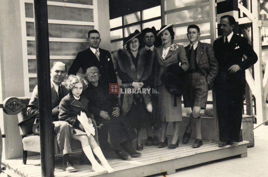 osservazioni | Da sinistra Saul Giulio Levi, Valeria Levi (poi coniugata Terni), la signora Teresa (governante di casa Levi Coen Sacerdotti), Franco Coen Sacerdotti, Vittoria Coen Sacerdotti in Segre, Paolo Segre, Elena Coen Sacerdotti in Levi, Guido Levi Sacerdotti, Massimo Segre. La fotografia รจ stata scattata alla Fiera di Milano all'esterno dello stand della ditta MEM dove Saul Giulio Levi lavorava. |