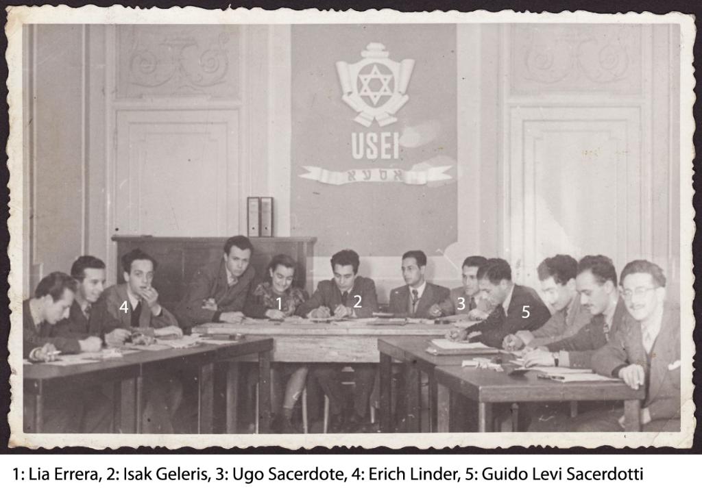 | osservazioni | La fotografia è stata eseguita al Raduno internazionale degli studenti ebrei del mondo; si riconoscono 1: Lia Errera, 2: Isak Geleris (che presiede la seduta), 3: Ugo Sacerdote, 4: Erich Linder, 5: Guido Levi Sacerdotti; nel gruppo è inoltre presente ma non identificato Luciano Coen. |