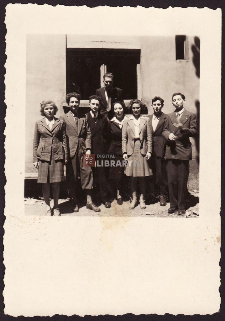 osservazioni | Da sinistra Anna Rosa Segre, Vittorio Tedeschi, un ragazzo non identificato, Guido Levi Sacerdotti, l'insegnante Lia Corinaldi, Laura Sacerdote, Franco Valabrega, Luciano Luria. Franco Valabrega fu deportato e morì a Buchenwald nel febbraio 1945 |