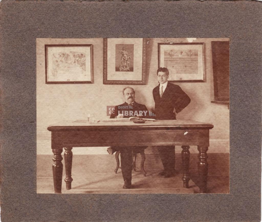 titolo attribuito | Ritratto di Saul Giulio levi con il preside della scuola il giorno del diploma di perito tessile con specializzazione in seterie |