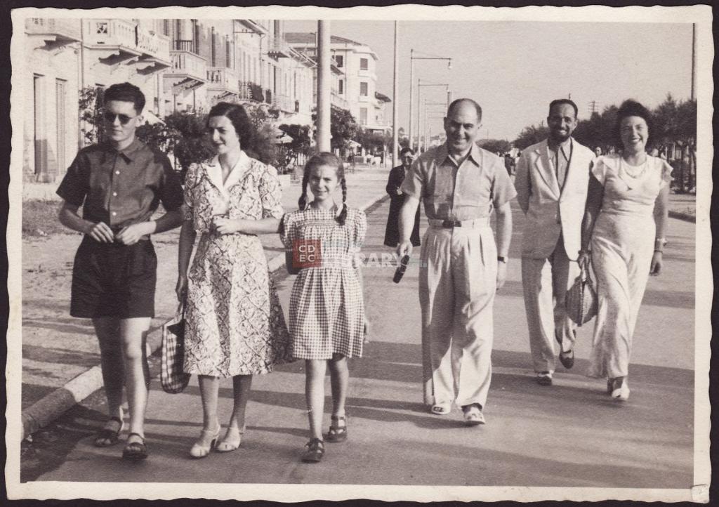 osservazioni | in primo piano da sinistra Guido Levi Sacerdotti, Elena Coen Sacerdotti in Levi, Valeria Levi (poi coniugata Terni), Saul Giulio Levi, una coppia di amici antifascisti del gruppo Calamandrei. Appena arrivata all'albergo la famiglia venne raggiunta da addetti della Polizia che notificarono l'ordine di ripartire immediatamente in quanto, essendo in città Edda Ciano, non era gradita la presenza di cittadini di "razza ebraica"; la famiglia fu accompagnata al treno sotto scorta delle guardie. [nota del donatore Guido Levi Sacerdotti] |