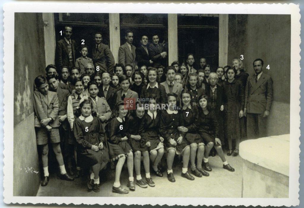 osservazioni | Nella fotografia si riconoscono 1: Mario Teglio, 2: Bruno D'Angeli, 3: prof. Giovannina Sullam, 4: prof. Renzo Levis, 6: Daisy Romanelli, 7: Loredana Pesaro, 8: Franco Dina. Accanto a Giovannina Sullam è ritratta Nella Fano |