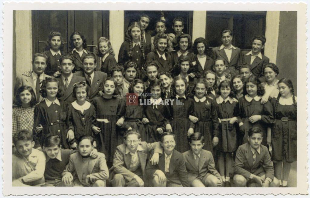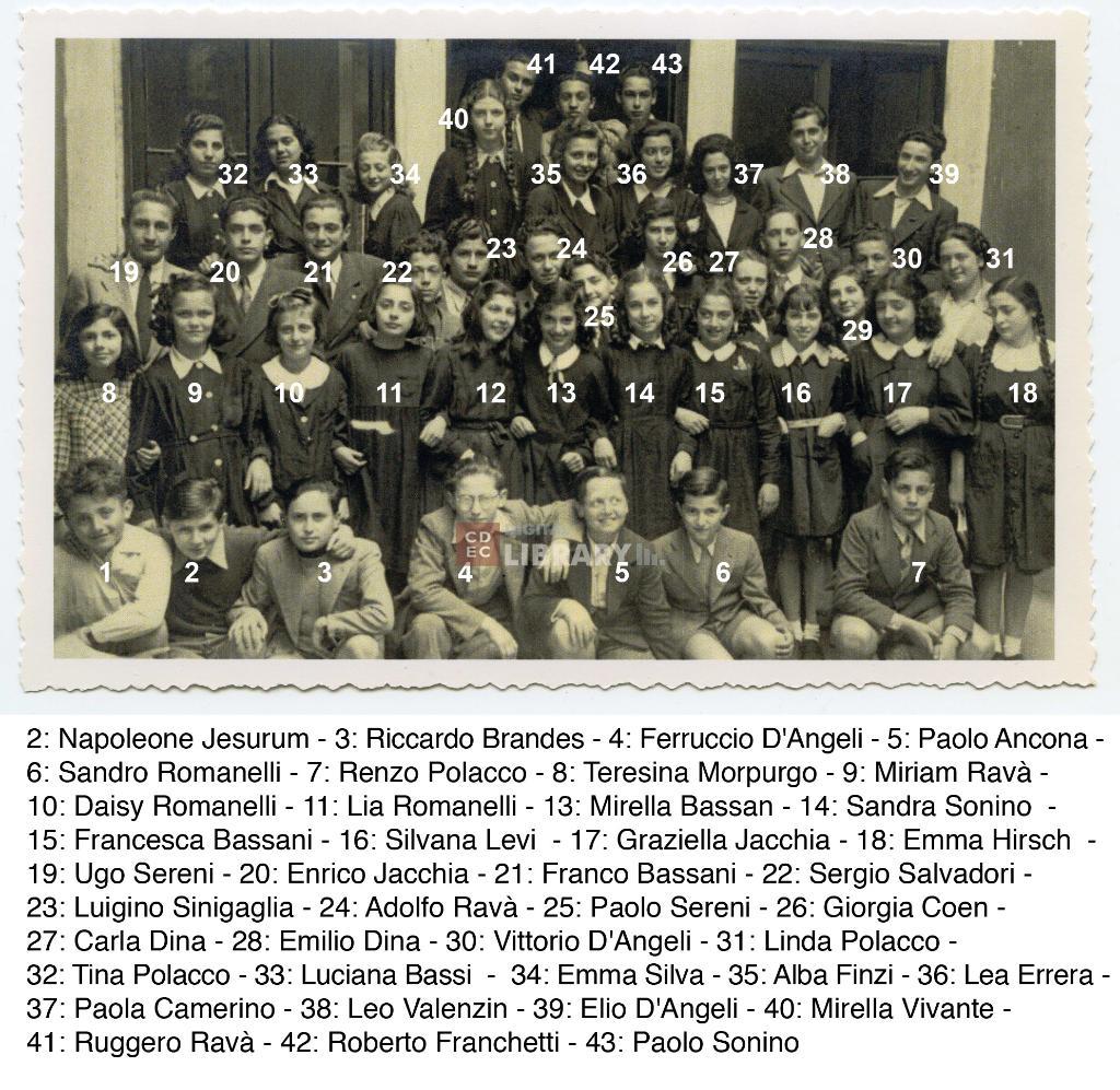 osservazioni | Nella fotografia si riconoscono: in prima fila da sinistra, accovacciati 2: Napoleone (detto Leo) Jesurum, 3: Riccardo Brandes, 4: Ferruccio D'Angeli, 5: Paolo Ancona, 6: Sandro Romanelli, 7: Renzo Polacco; in seconda fila da sinistra: 8: Teresina Morpurgo, 9: Miriam Ravà (poi coniugata Di Nepi), 10: Daisy Romanelli, 11: Lia Romanelli, 13: Mirella Bassan, 14: Sandra Sonino (poi coniugata Jesurum), 15: Francesca Bassani, 16: Silvana Levi (poi coniugata Luzzati), 17: Graziella Jacchia, 18: Emma Hirsch (poi coniugata Weiss Levi); in terza fila da sinistra: 19: Ugo Sereni, 20: Enrico Jacchia, 21: Franco Bassani, 22: Sergio Salvadori, 23: Luigino Sinigaglia, 24: Adolfo Ravà, 25: Paolo Sereni, 26: Giorgia Coen (poi coniugata Segre Amar), 27: Carla Dina (poi coniugata Salvalaggio), 28: Emilio Dina, 30: Vittorio D'Angeli, 31: la segretaria della scuola Linda Polacco; in quarta fila da sinistra: 32: Tina Polacco (poi coniugata Sonnino), 33: Luciana Bassi (poi coniugata Sullam), 34: Emma Silva, 35: Alba Finzi, 36: Lea Errera, 37: Paola Camerino, 38: Leo Valenzin, 39: Elio D'Angeli; in quinta fila da sinistra: 40: Mirella Vivante (poi coniugata Landes Goss), 41: Ruggero Ravà, 42: Roberto Franchetti, 43: Paolo Sonino. Non sono stati al momento identificate le persone indicate con il numero 1, 12 e 29 |