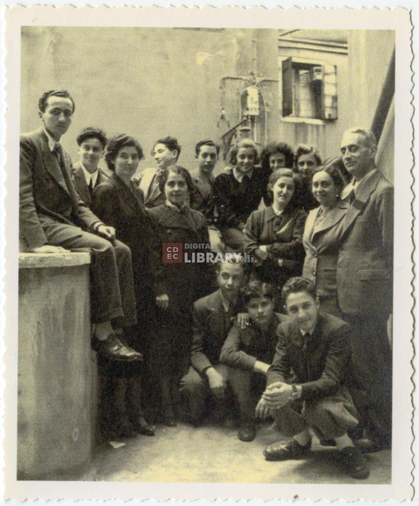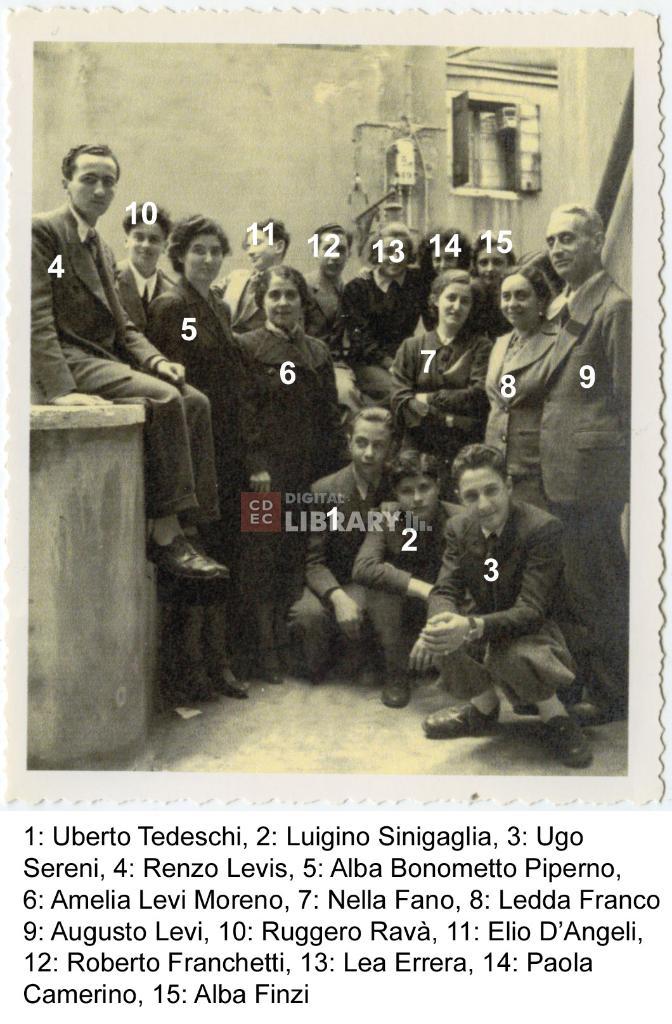 osservazioni | Nella fotografia si riconoscono 1: Uberto Tedeschi, 2: Luigino Sinigaglia, 3: Ugo Sereni, 4: prof. Renzo Levis, 5: prof.ssa Alba Bonometto Piperno, 6: prof.ssa Amelia Levi Moreno, 7: prof.ssa Nella Fano, 8: prof.ssa Ledda Franco, 9: il preside Augusto Levi, 10: Ruggero Ravà, 11: Elio D'Angeli, 12: Roberto Franchetti, 13: Lea Errera, 14: Paola Camerino, 15: Alba Finzi |