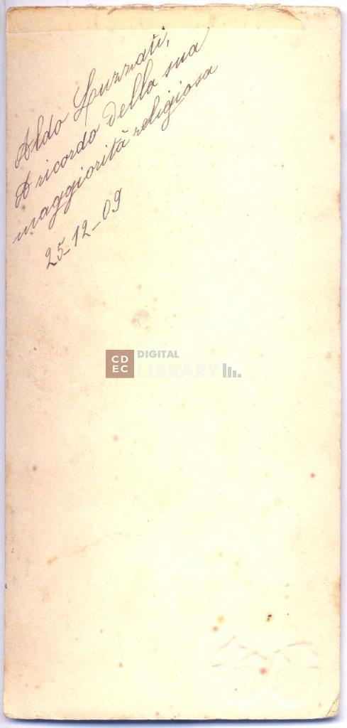 | iscrizioni | sul verso del supporto secondario l'indicazione manoscritta "Aldo Luzzati, A ricordo della sua maggiorità religiosa/ 25-12-09" |