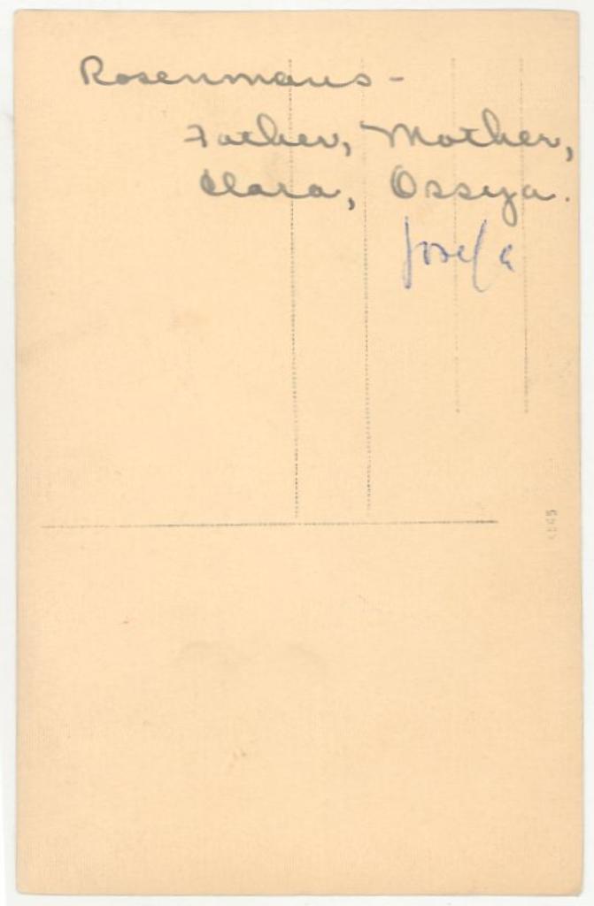| osservazioni | Nella fotografia si riconoscono da sinistra Clara Rosenman (poi coniugata Palant), la madre Emilia Adler in Rosenman, il padre Israel (Srulik) Rosenman e Hassia (Josefa) Rosenman |
