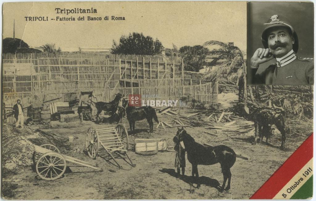 | titolo attribuito | Veduta della Fattoria del Banco di Roma a Tripoli e nel riquadro in alto a destra ritratto di Giuseppe Enrico Levi |