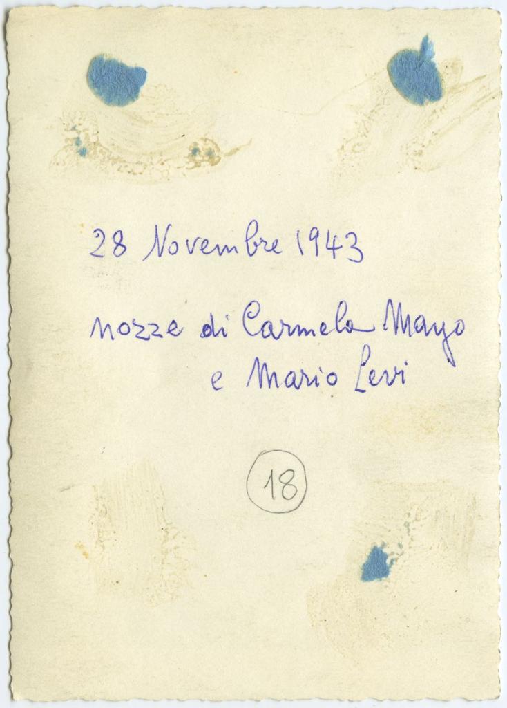 | iscrizioni | sul verso del supporto l'indicazione manoscritta "28 Novembre 1943/ nozze di Carmela Mayo e Mario Levi" |