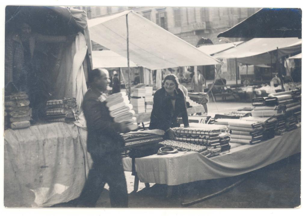 | titolo attribuito | Marco e Pia Levi lavorano al loro banco ambulante di tessuti |