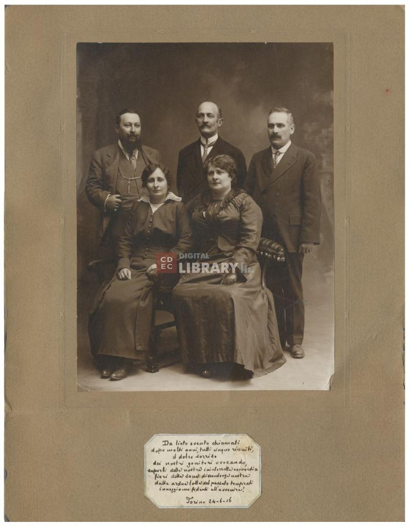 | iscrizioni | sul recto del supporto secondario in basso la dedica "Da lieto evento chiamati/ dopo molti anni, tutti cinque riuniti,/ il dolce sorriso/ dei nostri genitori evocando,/ superbi della nostra ininterrotta concordia/ fieri della sana discendenza nostra/ dalle ardue lotte del passato temprati/ inneggiamo fidenti all'avvenire!/ Torino 24-6-16" |