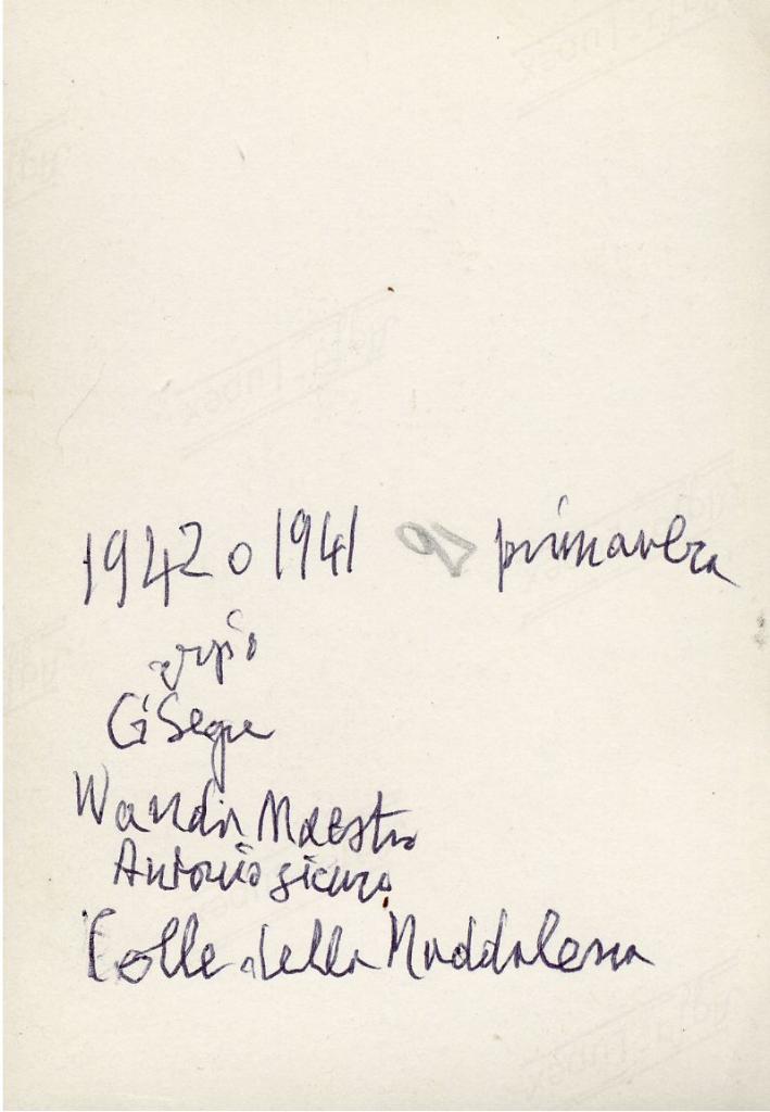 | iscrizioni | sul verso del supporto: "1942 o 1941 primavera Giorgio Segre Wanda Maestro Antonio Sicuro Colle della Maddalena" |
