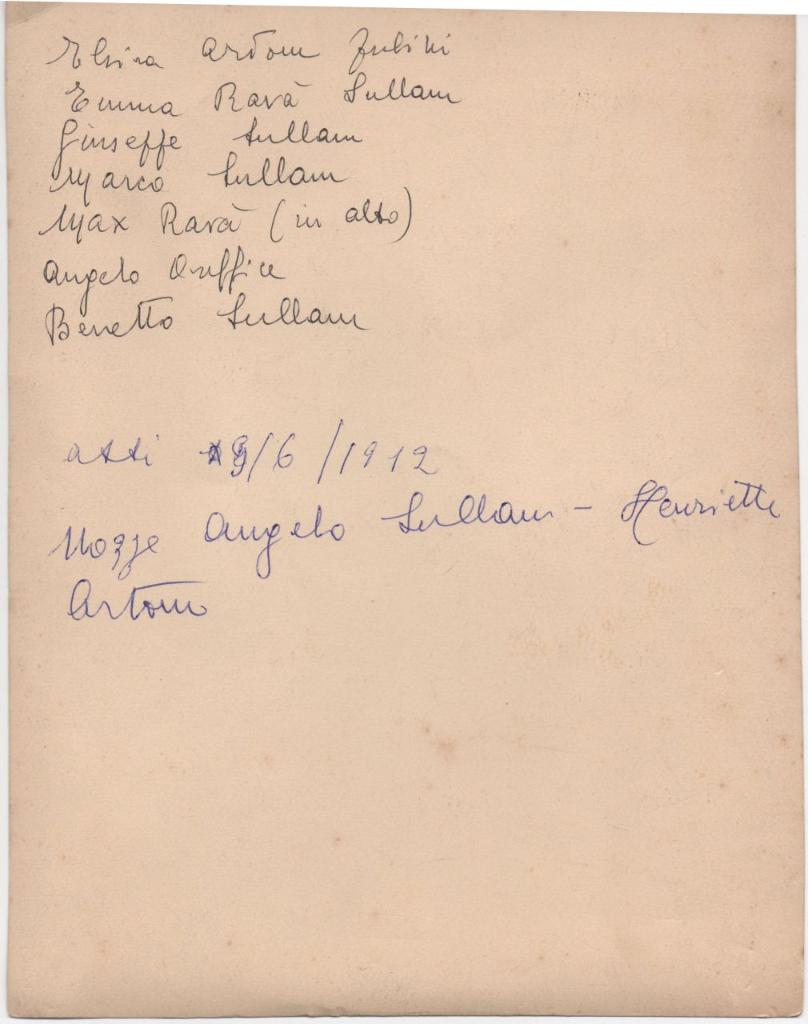 | osservazioni | Da sinistra Elvira Fubini in Artom, Emma Sullam in Ravà (in abito chiaro con ampio cappello), Giuseppe Sullam, Marco (detto Bismarck) Sullam, Angelo Oreffice, Benedetto Sullam; in secondo piano con il cilindro Massimiliano (Max) Ravà |