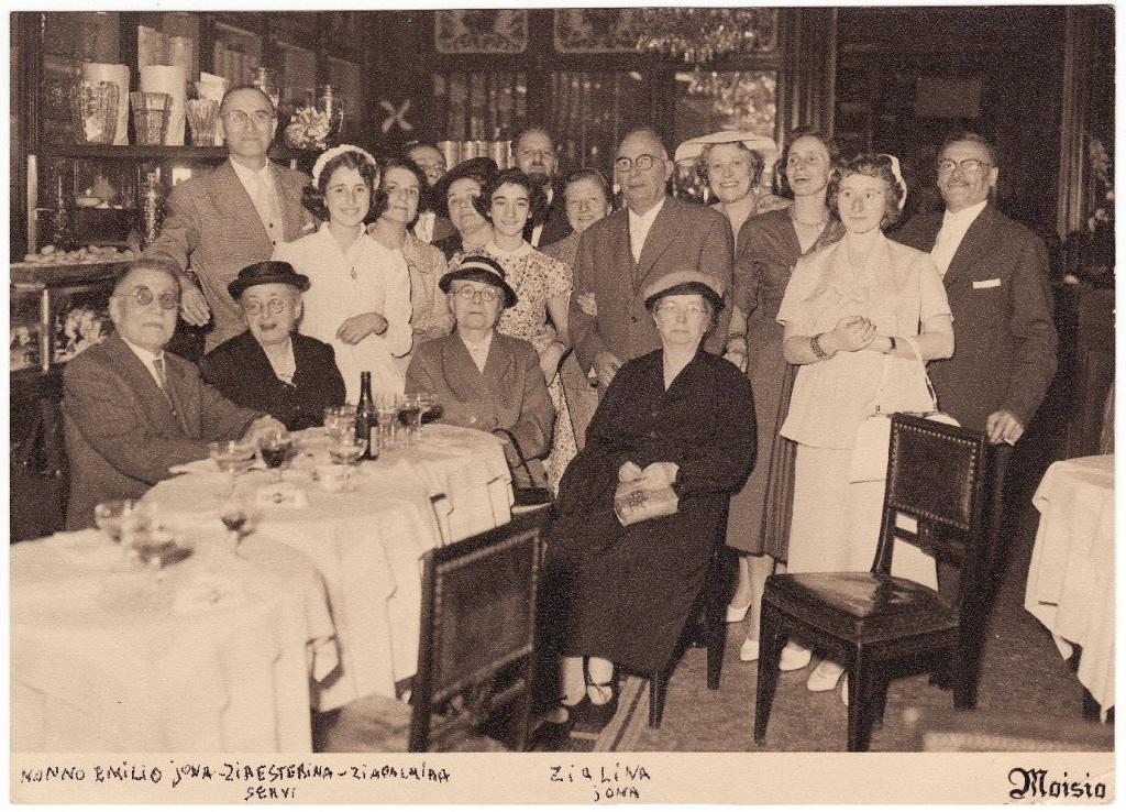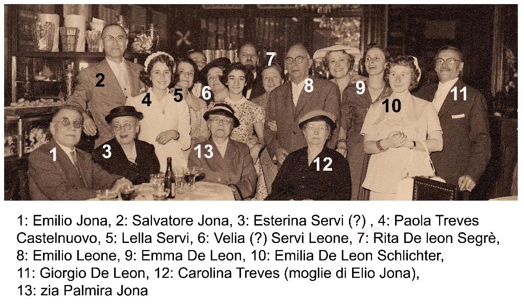 | osservazioni | Nella fotografia si riconoscono 1: Emilio Jona, 2: Salvatore Jona, 3: Esterina Jona in Servi, 4: Paola Castelnuovo (poi coniugata Treves), 5: Marcella (detta Lella) Servi in Castelnuovo, 6: Virginia (detta Vergia) Servi in Leone, 7: Margherita (della Rita) Segré in De Leon, 8: Emilio Leone, 9: Emma Segrè in De Leon, 10: Emilia De Leon (poi coniugata Schlichter), 11: Giorgio De Leon, 2: Carolina Treves in Jona, 13: Palmira Jona |