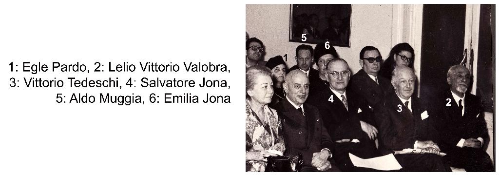 | osservazioni | Nella fotografia si riconoscono 1: Egle Sullam in Pardo, 2: Lelio Vittorio Valobra, 3: Vittorio Tedeschi, 4: Salvatore Jona, 5: Aldo Muggia, 6: Emilia Pardo in Jona |
