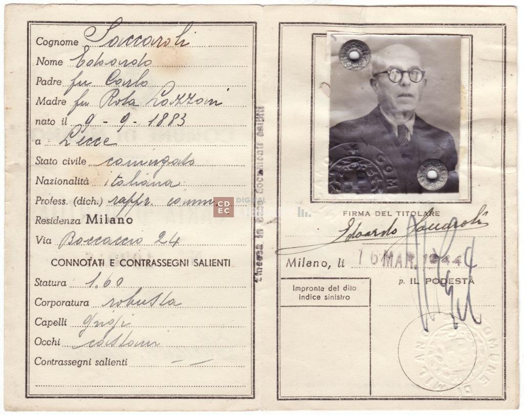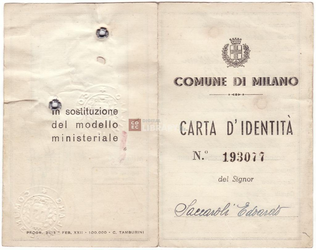 titolo attribuito | Carta d'identità con false generalità di Saccaroli Edoardo (alias Sacerdote Edoardo) |