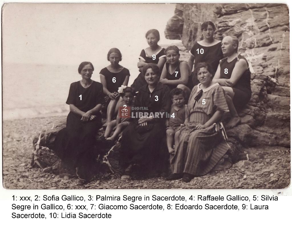 osservazioni | Nella fotografia si riconoscono 2: Sofia Gallico (figlia di Guido e di Silvia Segre), 3: Palmira Segre in Sacerdote, 4: Raffaele Gallico (fratello di Sofia), 5: Silvia Segre in Gallico (sorella di Palmira), 7: Giacomo Sacerdote, 8: Edoardo Sacerdote, 9: Laura Sacerdote, 10: Lidia Sacerdote |