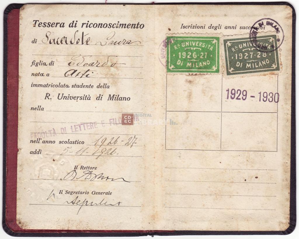 osservazioni | Nell'anno accademico 1926-27 Laura Sacerdote (poi coniugata Perrini) risulta immatricolata alla Facoltà di Lettere e Filosofia della R. Università di Milano |