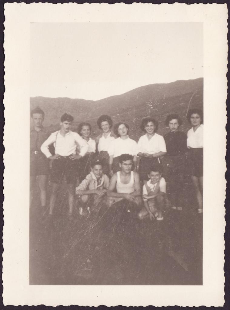 | osservazioni | Da sinistra in piedi: Silica [?], Sergio Valabrega, Ada Luzzati (poi coniugata Ortona), Elena Ottolenghi, Eloisa Ravenna, Liliana Treves, Laura Ravenna, Delia Luzzati; in primo piano accosciati: Giuseppe Tedesco, Guido Valabrega, Enzo De Benedetti |