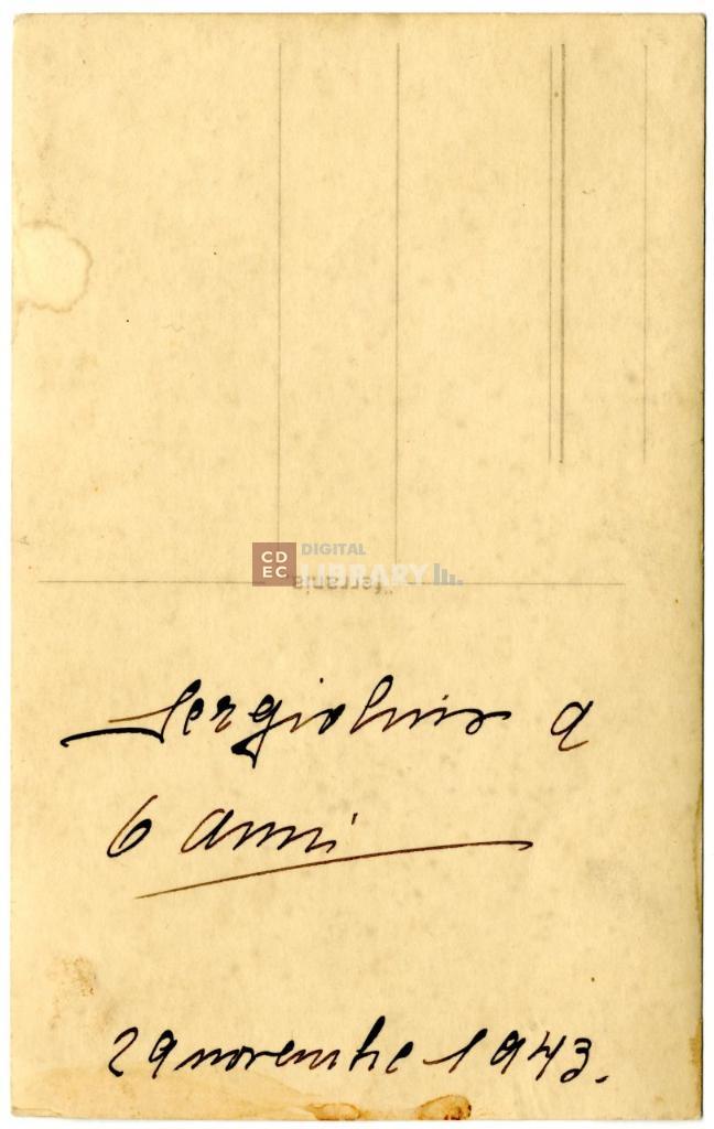 iscrizioni | sul verso del supporto: "Sergiolino a 6 anni - 29 novembre 1943" |