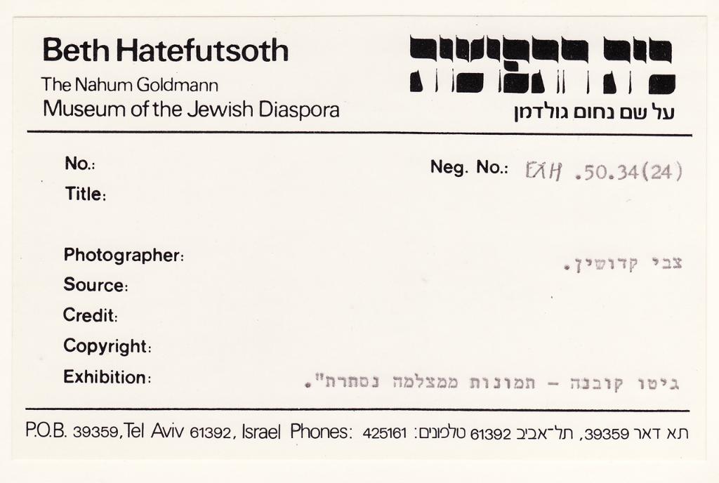 | osservazioni | Sull'etichetta del Museo della Diaspora è riportato in ebraico il nome del fotografo (Zvi Kadushin) e quello della mostra in cui è presente la fotografia (ghetto di Kovno) |