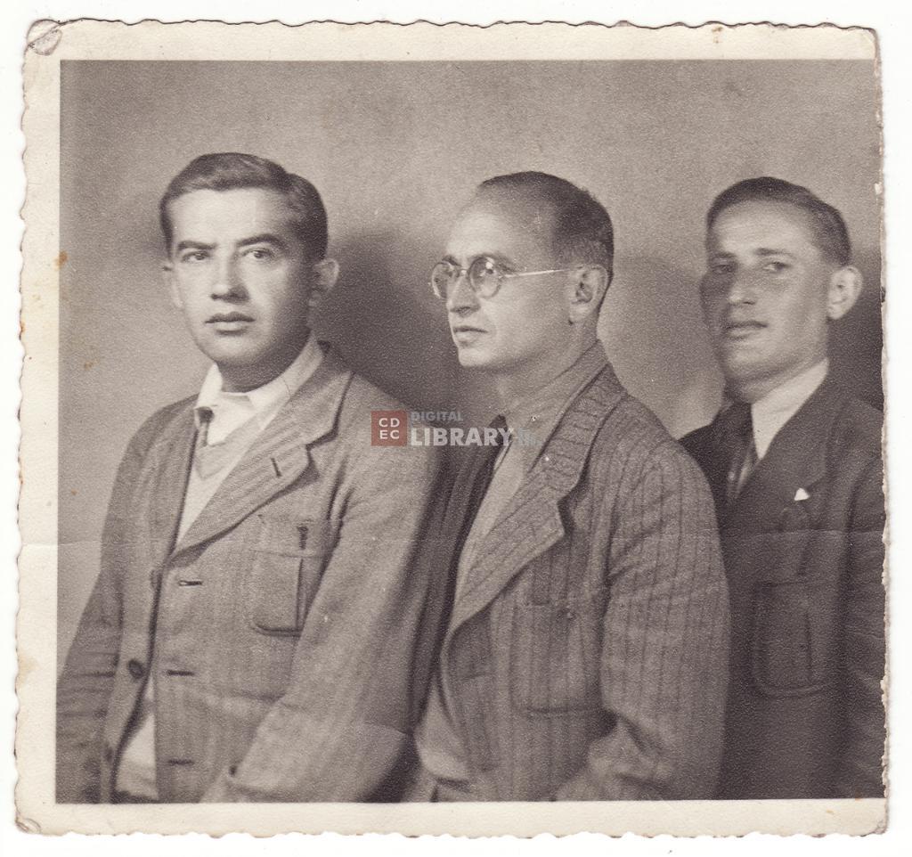 | titolo attribuito | Shneir Matz, a sinistra, appena uscito dal lager, con due sopravvissuti al campo di Dachau subito dopo la liberazione |