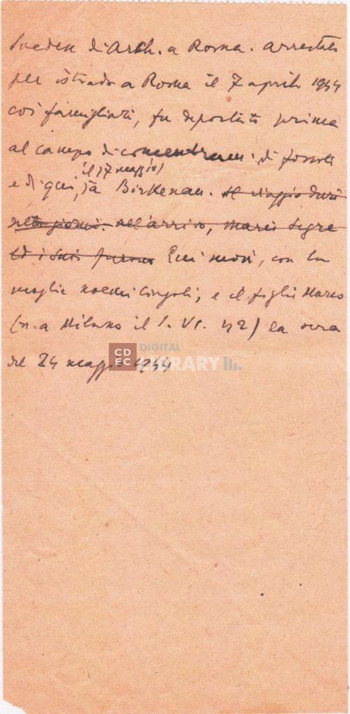 | bibliografia | Il libro della memoria. Gli Ebrei deportati dall'Italia 1943-1945 / Liliana Picciotto; Ricerca della Fondazione Centro di Documentazione Ebraica Contemporanea - Ed. 2002: altri nomi ritrovati - Milano: Mursia, 2002 |