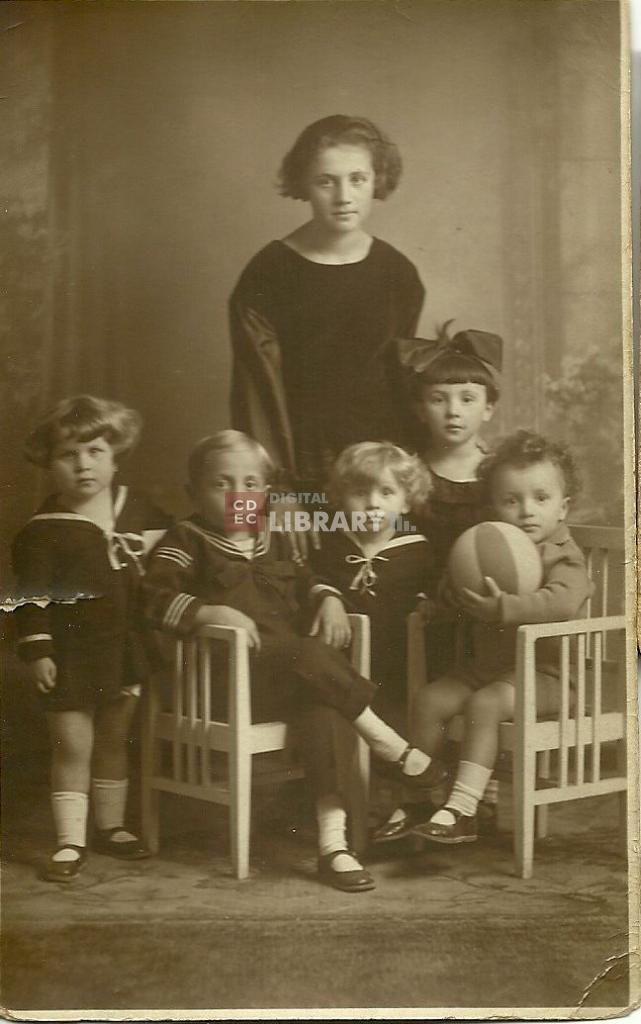 osservazioni | Da sinistra Magda Goldstein, Ladislao (detto Laci) Lager, Andrea Goldstein, Caterina (detta Cati) Lager, Andrea Lager con la palla. In piedi Ella Preisler |