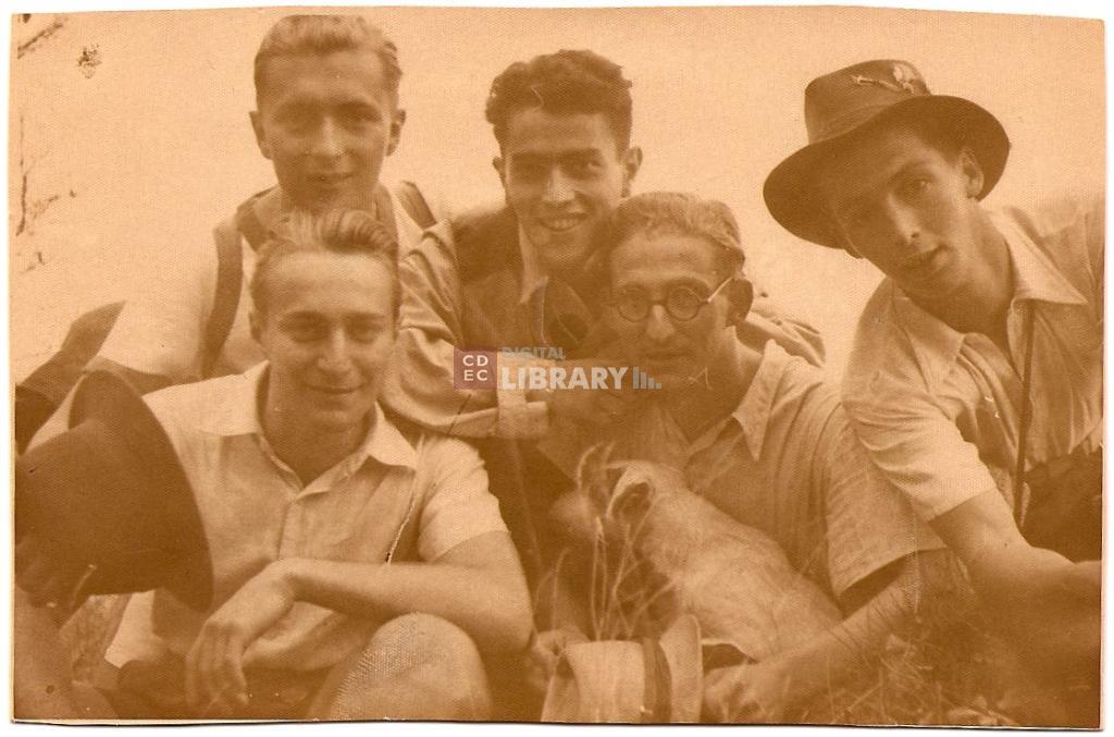 osservazioni | Martino Godelli in escursione sul Monte Sacco, all'interno dell'Istria, รจ al centro, sorridente, col braccio destro appoggiato sulla spalla del ragazzo con gli occhiali. |