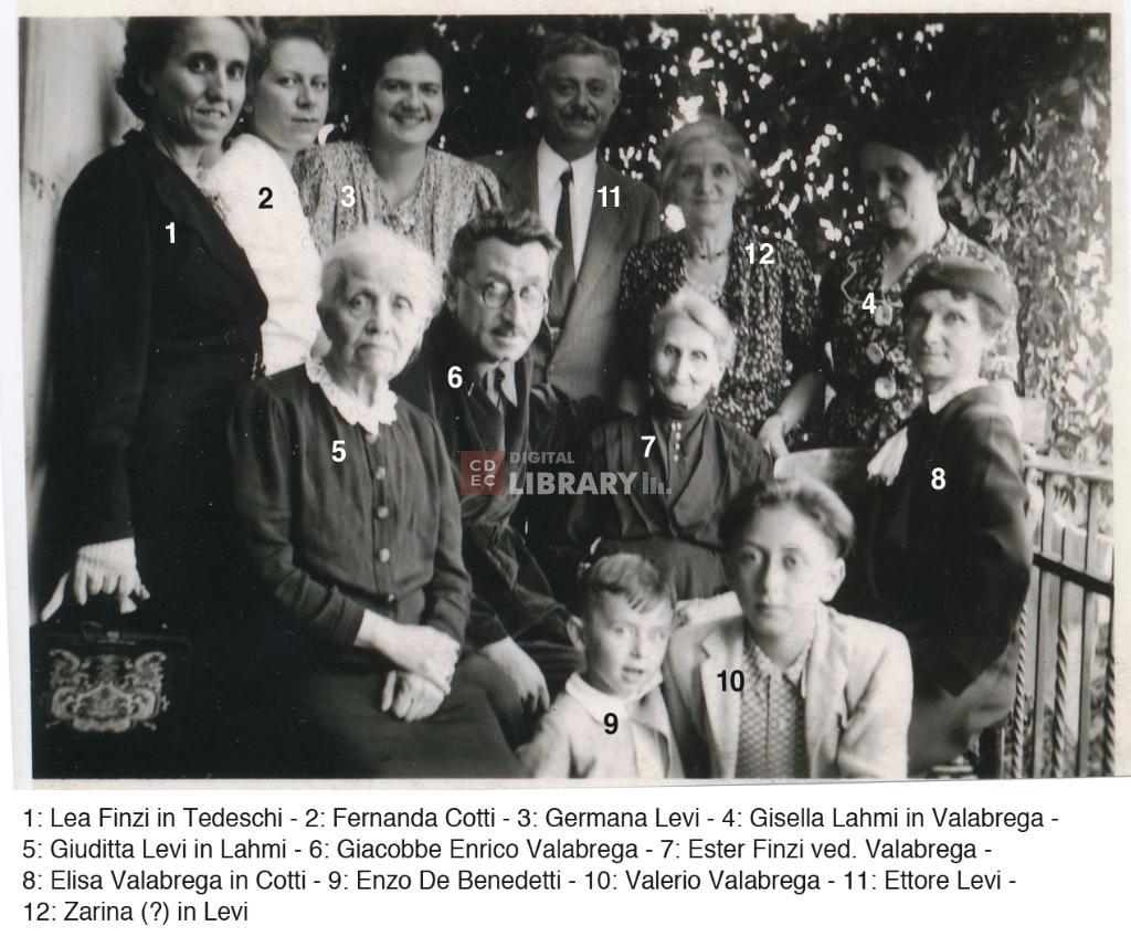 | osservazioni | Nella fotografia si riconoscono 1: Lea Finzi in Tedeschi, 2: Fernanda Cotti, 3: Germana Levi, 4: Gisella Lahmi in Valabrega, 5: Giuditta Levi in Lahmi, 6: Giacobbe Enrico Valabrega, 7: Ester Finzi vedova Valabrega, 8: Elisa Valabrega in Cotti, 9: Enzo De Benedetti, 10: Valerio Valabrega. Forse 11 e 12 sono i genitori di Germana Levi, Ettore Levi e Zarina [?] in Levi |