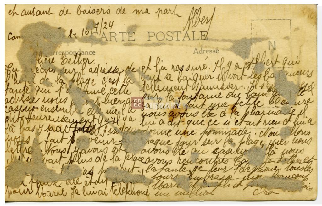 iscrizioni | sul verso del supporto lunga lettera manoscritta in francese a firma "Oro" - in alto una frase a firma "Albert" e la data "16/7/24" |
