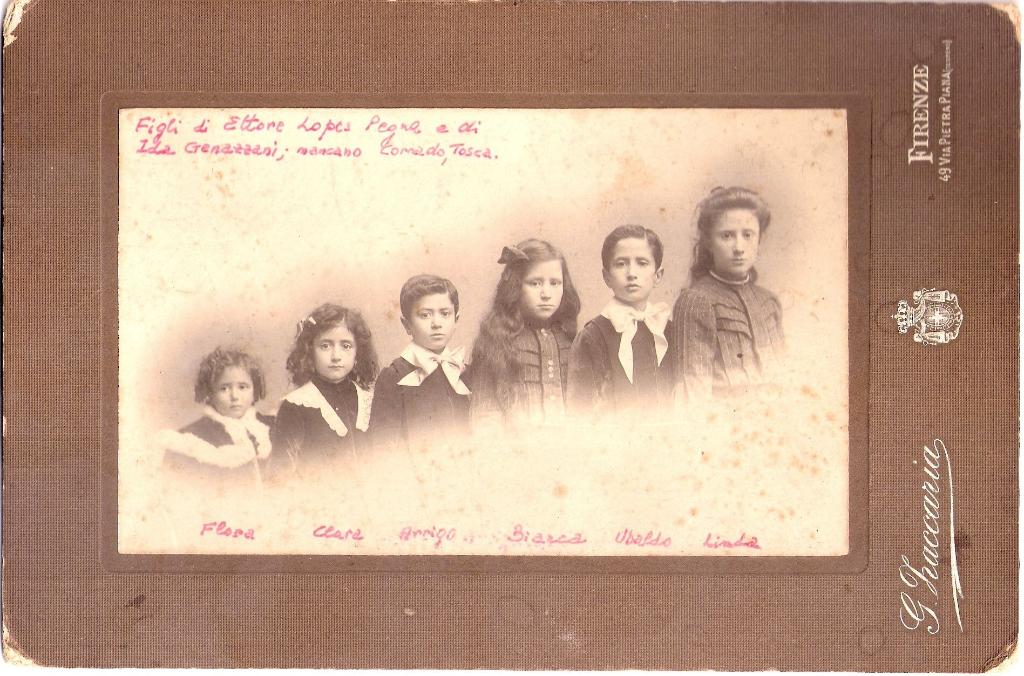 | osservazioni | Da sinistra Flora Lopes Pegna (poi coniugata Caro), Clara Lopes Pegna (poi coniugata Caro), Arrigo Lopes Pegna, Bianca Lopes Pegna (poi coniugata De Pas), Ubaldo Lopes Pegna e Linda Lopes Pegna (poi coniugata Cortesi) |