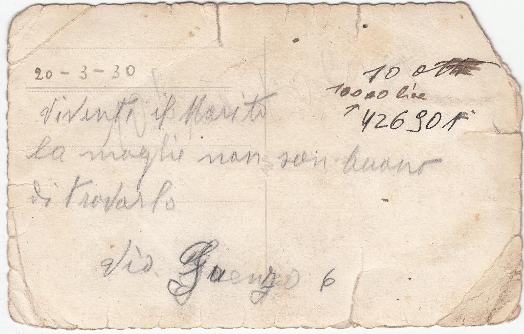 | iscrizioni | sul verso del supporto: "20-3-30/ Viventi il marito la moglie non son buono di trovarlo/ via Faenza 6/ 10 ott 1000 lire 426901" |