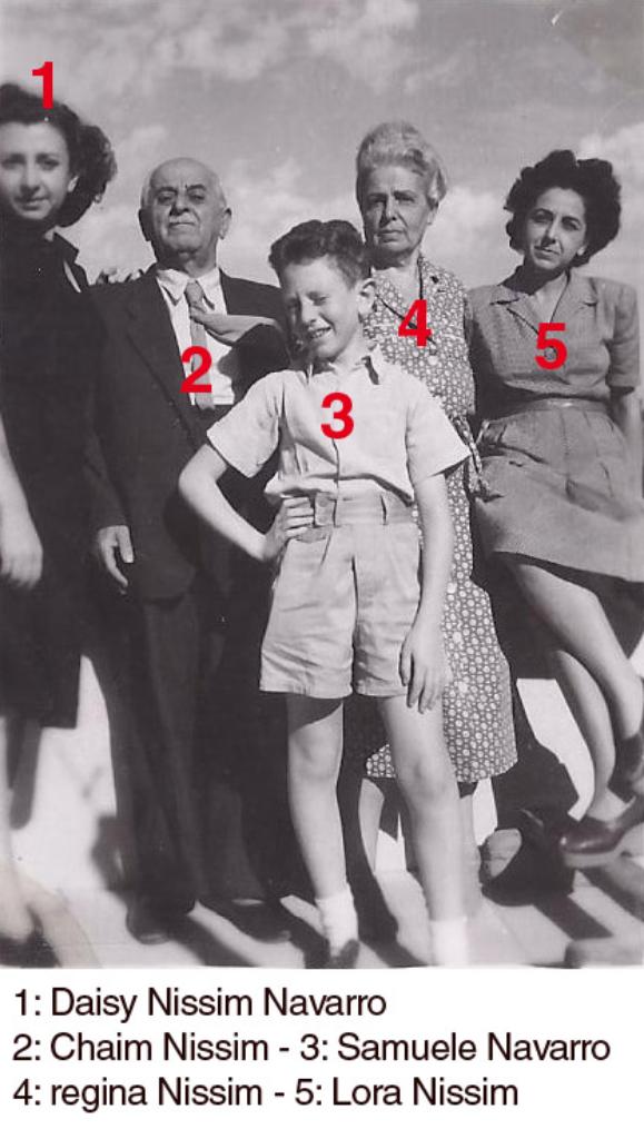 | osservazioni | Gruppo famigliare con Daisy Nissim Navarro, i genitori, la sorella Lora Nissim e il figlio Samuele Navarro bambino. 1: Daisy Nissim in Navarro - 2: Chaim Nissim - 3: Samuele Navarro - 4: Regina sposata Nissim - 5: Lora Nissim. |