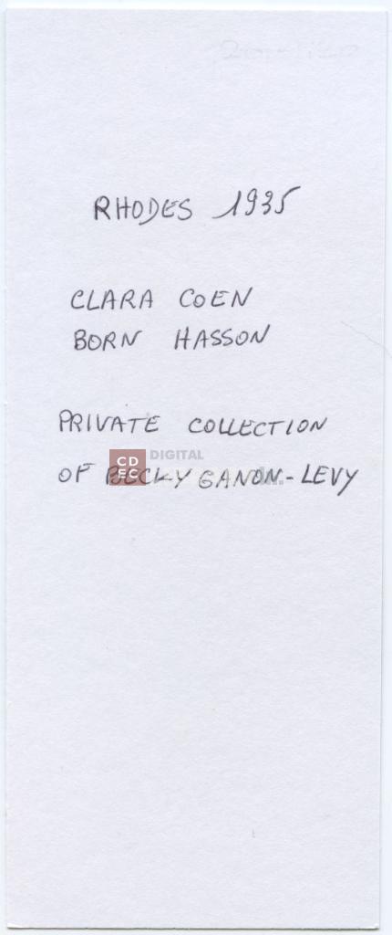 iscrizioni | sul verso del supporto la didascalia manoscritta "Rhodes 1935/ Clara Coen born Hasson" e "Private Collection of Becky Ganon - Levy" |