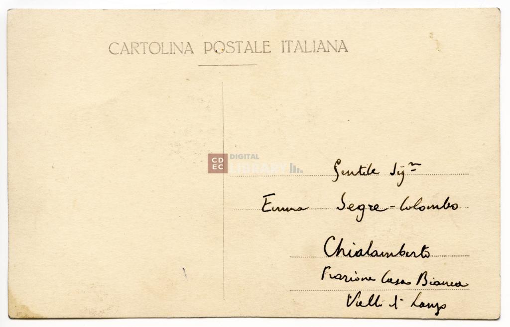 | iscrizioni | sul verso del supporto l'indicazione manoscritta: " Gentile Sig.ra Emma Segre-Colombo/ Chialamberto/ Frazione Casa Bianca/ Valle di Lanzo" |