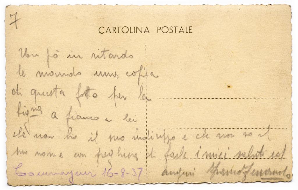 | iscrizioni | sul verso, a mano, una lunga dedica e in basso a sinistra: "Courmayeur 16-8-37". |