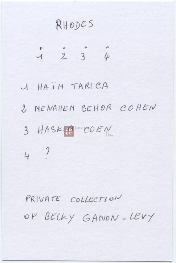 iscrizioni | sul verso del supporto la didascalia manoscritta "Rhodes/ 1 Haim Tarica 2 Menahem Behor Cohen 3 Haskia Coen 4 ?" e "Private Collection of Becky Ganon - Levy" |
