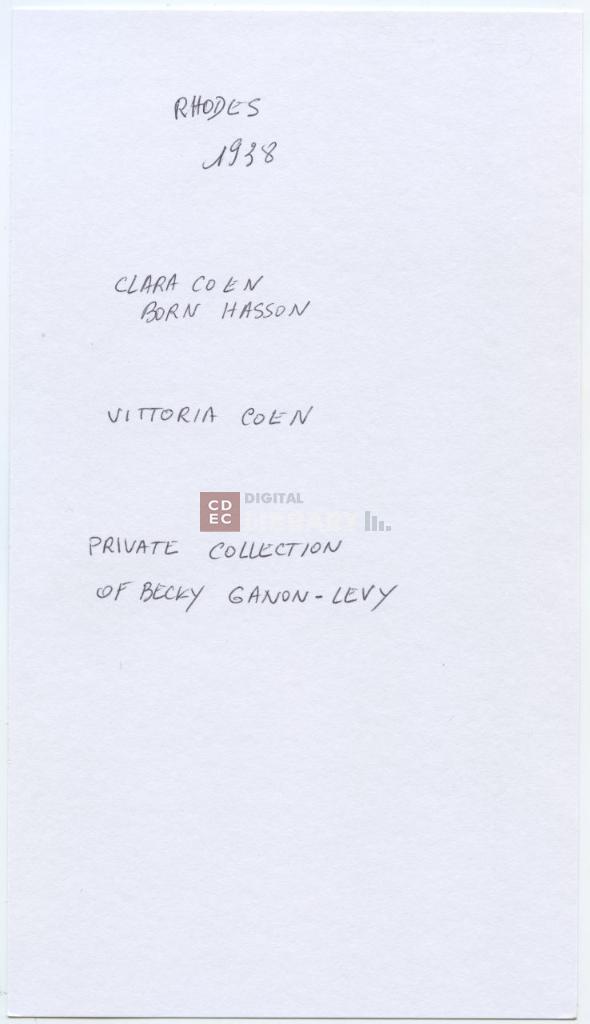 iscrizioni | sul verso del supporto la didascalia manoscritta "Rhodes 1938/ Clara Coen born Hasson/ Vittoria Hasson" e "Private Collection of Becky Ganon - Levy" |