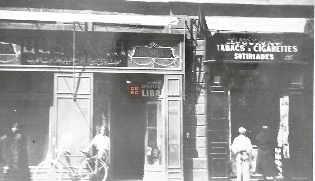 iscrizioni | nell'immagine insegne con scritte in arabo e in francese: a destra "Busnach Musique" e a sinistra "Tabacs & cigarettes Sotiriades" |