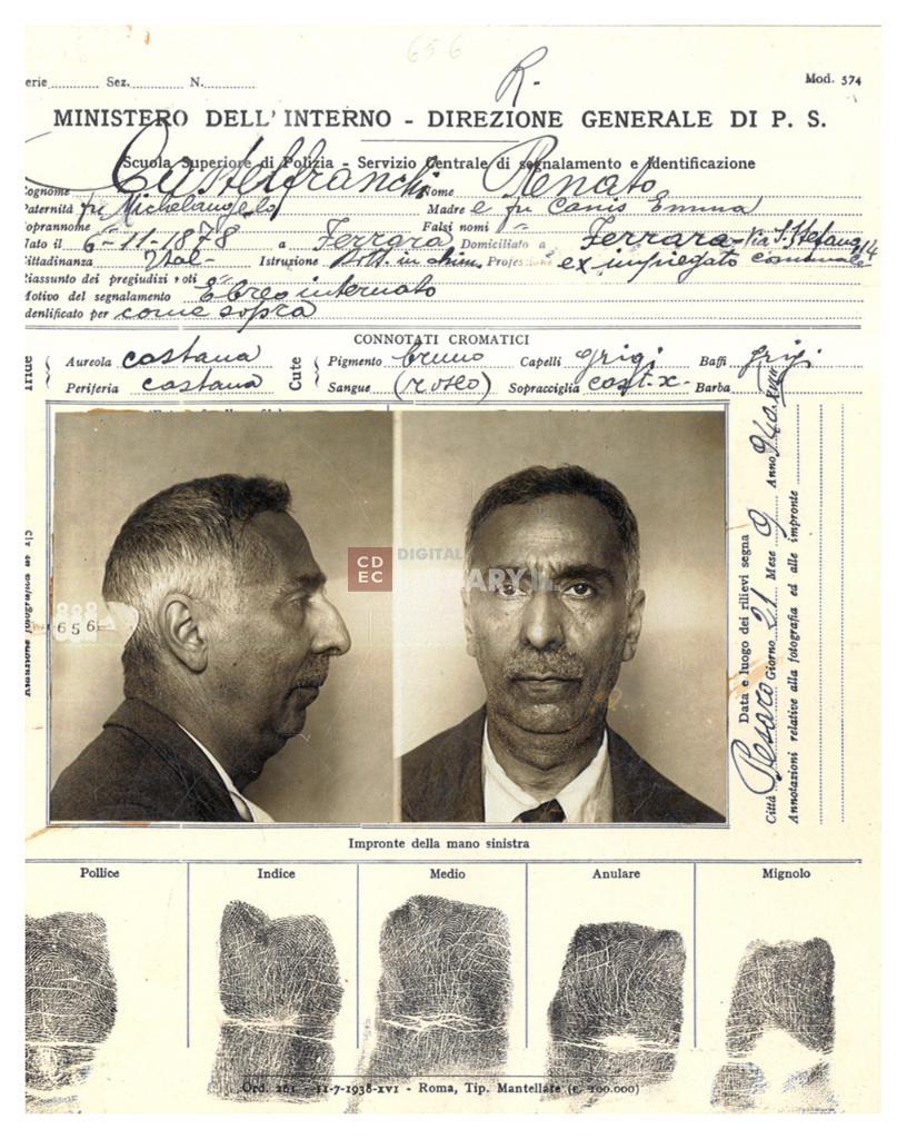 | osservazioni | Il documento, a cura del Servizio centrale di segnalamento e identificazione della Scuola superiore di Polizia, riporta i rilievi segnaletici di Renato Castelfranchi e fu compilato dalla Divisione Polizia del Ministero dell'Interno, Direzione generale di Pubblica Sicurezza di Pesaro il 21 settembre 1940; motivo della segnalazione alle Autorità il fatto di essere un "ebreo internato". Renato Castelfranchi fu deportato ad Auschwitz. |