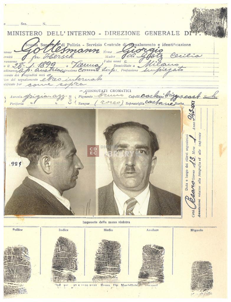 | osservazioni | Il documento, a cura del Servizio centrale di segnalamento e identificazione della Scuola superiore di Polizia, riporta i rilievi segnaletici di Gottesmann Giorgio e fu compilato dalla Divisione Polizia del Ministero dell'Interno, Direzione generale di Pubblica Sicurezza di Pesaro il 13 gennaio 1943; motivo della segnalazione alle Autorità il fatto di essere un "ebreo internato". Georg Gottesmann morì nell'eccidio del campo di aviazione di Forli il 5 settembre 1944. |