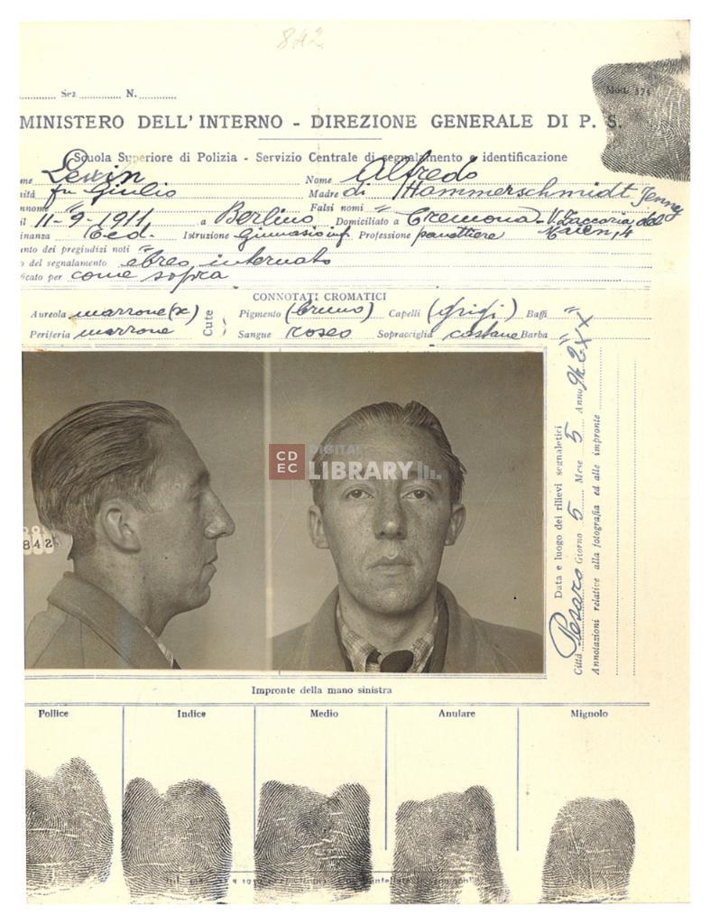 | osservazioni | Il documento, a cura del Servizio centrale di segnalamento e identificazione della Scuola superiore di Polizia, riporta i rilievi segnaletici di Lewin Alfredo e fu compilato dalla Divisione Polizia del Ministero dell'Interno, Direzione generale di Pubblica Sicurezza di Pesaro il 5 maggio 1942; motivo della segnalazione alle Autorità il fatto di essere un "ebreo internato". Alfred Lewin morì nell'eccidio del campo di aviazione di Forli il 5 settembre 1944. |
