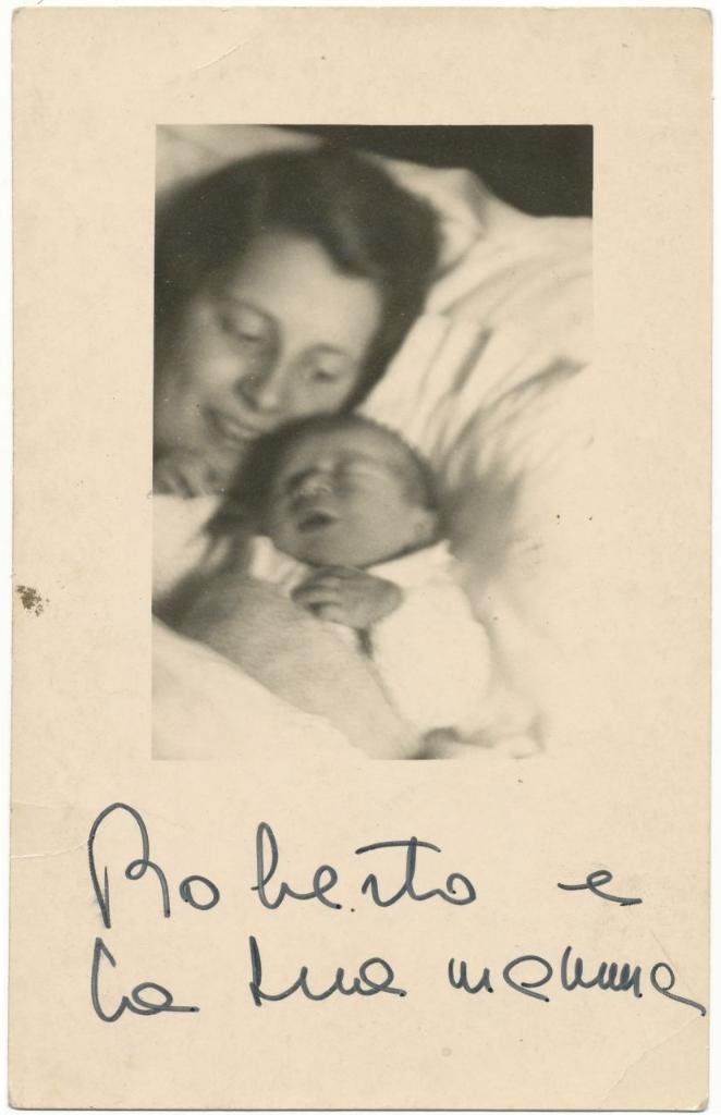 | iscrizioni | sul recto del supporto l'indicazione manoscritta: "Roberto e la sua mamma"; sul verso la dedica manoscritta: "Caro amore, questa foto รจ stata scattata da "mio padre" quando tu sei nato. Te la dono." |